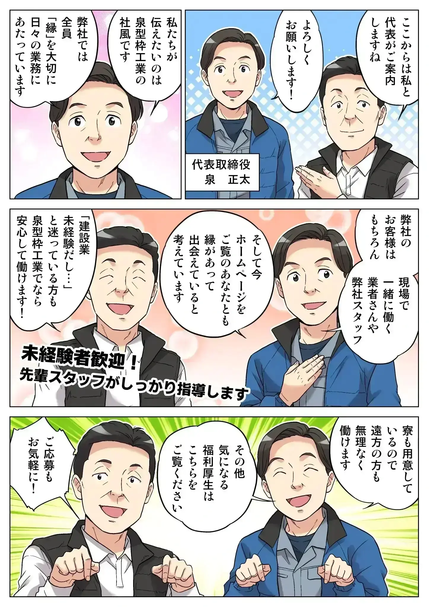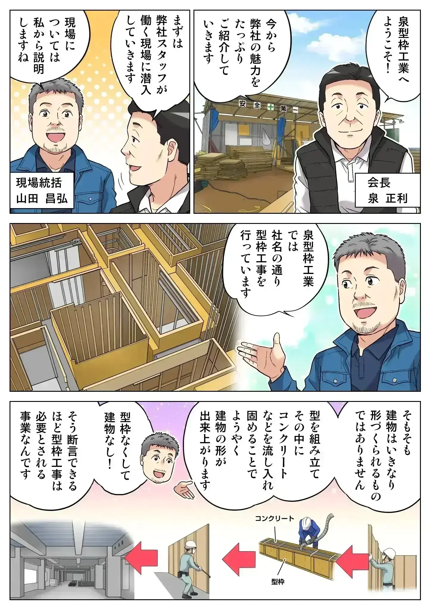社長・専務・現場統括の3名が漫画の中で泉型枠工業について分かりやすくご紹介します。